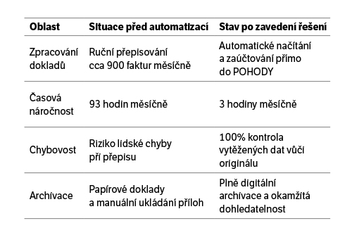 Díky chytrým šablonám a propojení s e-mailem nyní systém zpracovává doklady plně automaticky, včetně příloh, a zajišťuje jejich okamžitou dostupnost v digitálním archivu.